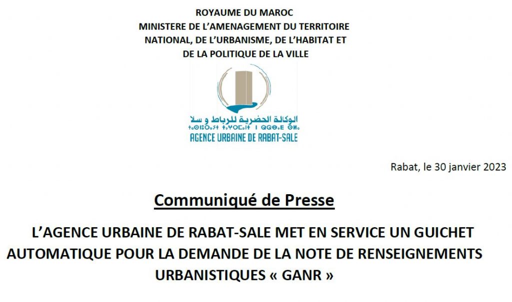 Communiqué : L’AGENCE URBAINE DE RABAT-SALE MET EN SERVICE UN GUICHET AUTOMATIQUE POUR LA DEMANDE DE LA NOTE DE RENSEIGNEMENTS URBANISTIQUES « GANR »